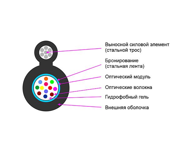 Подвесной оптический кабель, предназначен для наружной прокладки между опорами. Применяется в FTTx сетях, а также для прокладки в сетях до рабочих мест или до квартир и офисов абонентов. Кабель содержит 8 оптических волокон, соответствующие стандарту G.652D. Для защиты трубки с волокнами выполнено бронирование стальной лентой. В качестве силового элемента для подвеса используется стальной трос из 7 жил диам. 0,4мм. Внешняя оболочка изготавливается из MDPE (полиэтилен средней плотности). Кабель смотан в бухты по 1000 м на деревянной катушке.