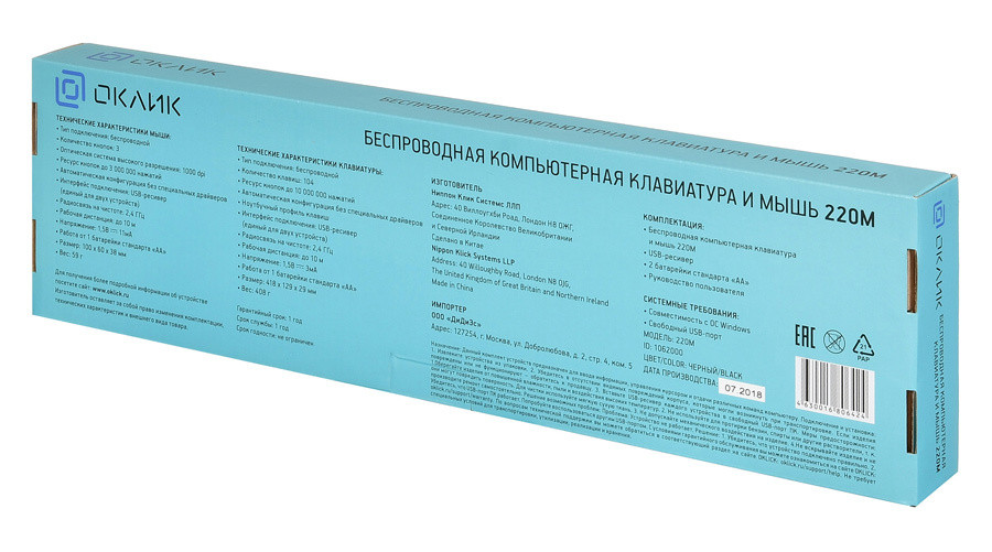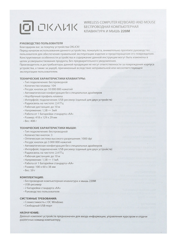 Комплект поставки: Беспроводная компьютерная клавиатура и мышь 220М.