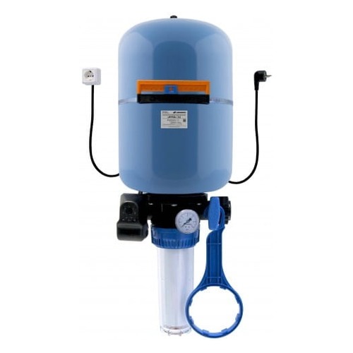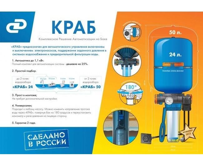 Описание: Решение автоматизации-комплексное Джилекс на баке КРАБ 24 предназначено для автоматического управления включением и выключением электронасосов, поддержания заданного давления в системах водоснабжения и предварительной фильтрации воды. Объем гидробака: 24л. Высота: 75см; Ширина: 27см