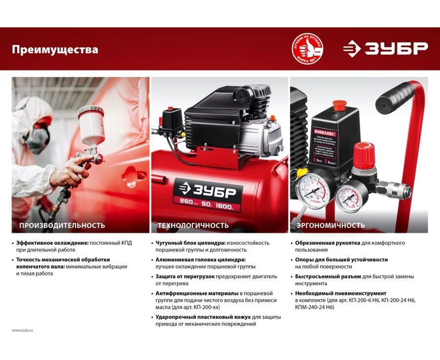 Механический клапан сброса давления. Шумозащитный пластиковый кожух. Регулировка давления на выходе позволяет настраивать давление воздуха зависимости от используемого пневмоинструмента. Самовосстанавливающийся термопредохранитель.