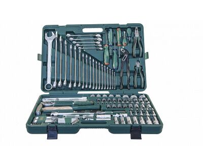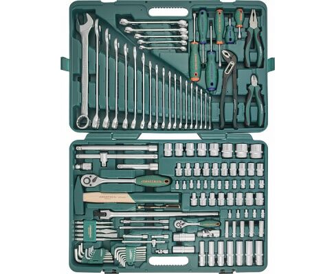 Универсальный набор инструмента состоит из 127 предметов, что позволяет выполнять работы любой сложности. Кейс оснащен рукояткой для удобной транспортировки набора инструментов. Вес: 15.6 кг.