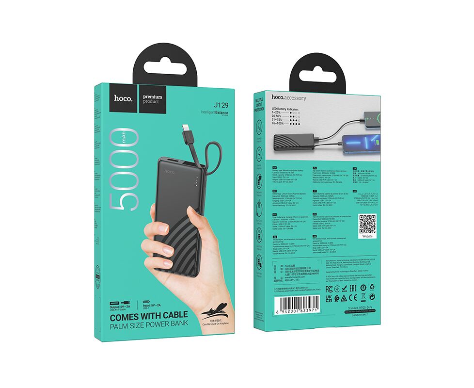 Внешний аккумулятор 5000mAh 1USB+Type-C 2.0A с LED-индикатором, кабель Lightning 8-pin Hoco j129 (Black)